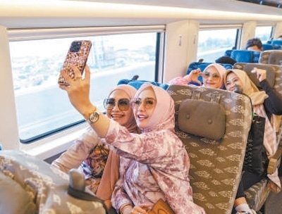 乘客在行駛中的雅萬(wàn)高鐵車(chē)廂內(nèi)拍照。作為“一帶一路”倡議和中印尼兩國(guó)務(wù)實(shí)合作的標(biāo)志性項(xiàng)目,雅萬(wàn)高鐵全線(xiàn)采用中國(guó)技術(shù)、中國(guó)標(biāo)準(zhǔn)。新華社記者 徐 欽攝