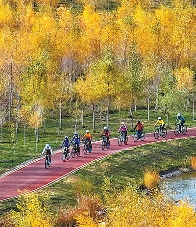 甘肅省張掖市奧林匹克森林公園,騎行愛(ài)好者們騎行穿過(guò)胡楊林。張掖市推進(jìn)綠化工程,亂石灘“變身”森林公園,成了市民健身休閑的理想之所。王 將攝(影像中國(guó))