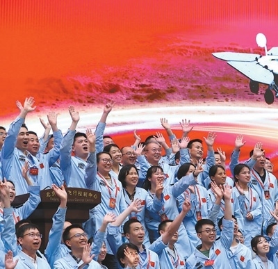 北京航天飛行控制中心青年科技人才群體慶祝我國(guó)首次火星探測(cè)任務(wù)著陸火星取得成功。目前,我國(guó)研發(fā)人才數(shù)量全球第一。新華社記者 金立旺攝