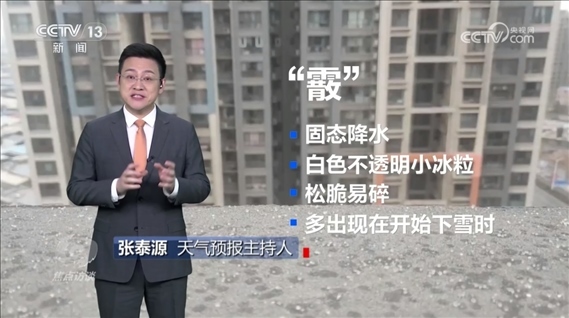 天氣預報主持人張?zhí)┰矗骸啊薄且环N固態(tài)降水,由白色不透明的小冰粒組成,近似球形,有時呈圓錐形,有雪狀結(jié)構(gòu),通常在地面氣溫不太冷時降落,在剛開始下雪的時候出現(xiàn)?!?/p>