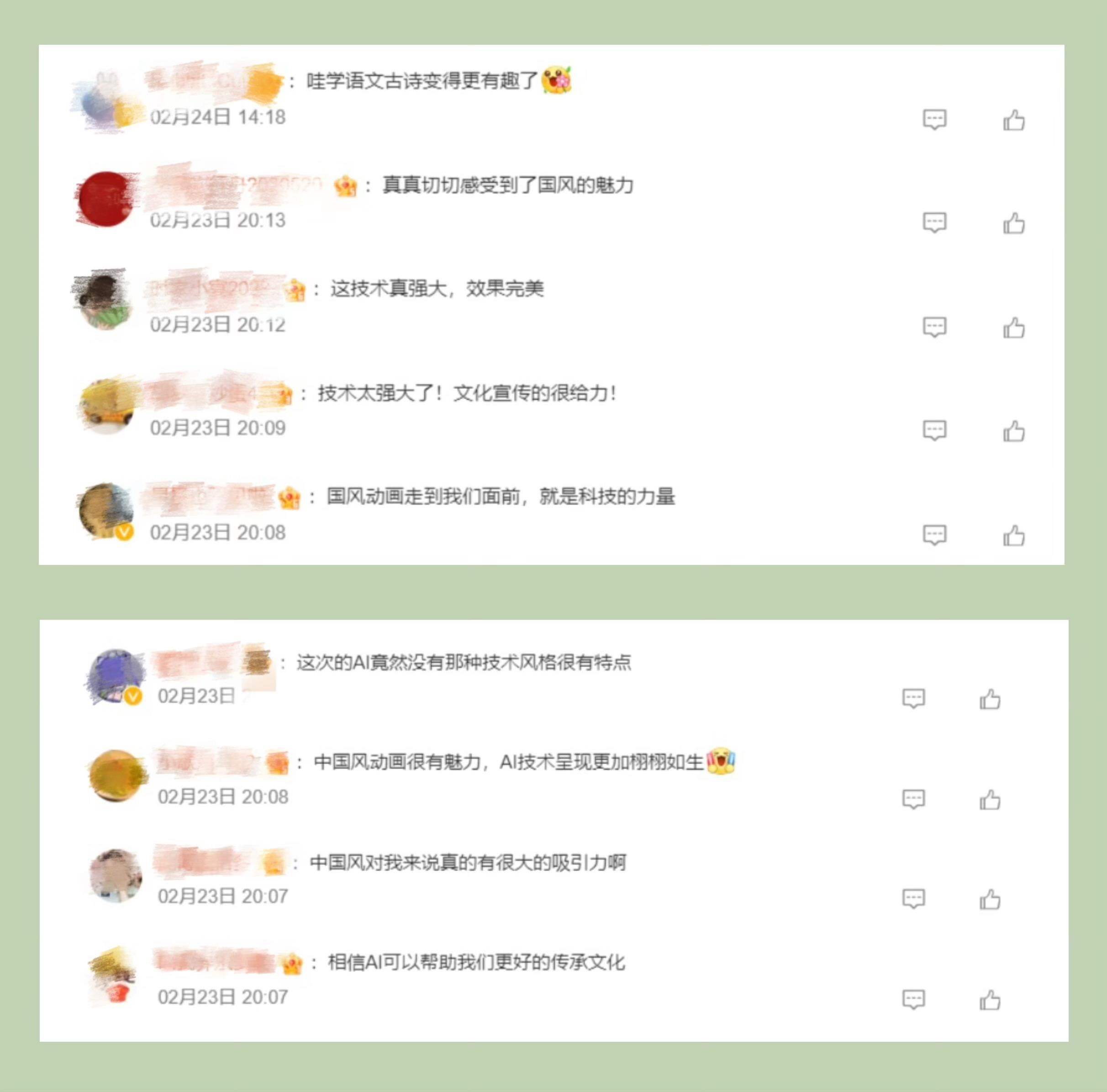 節(jié)目探索詩畫融通的國風(fēng)動畫片新呈現(xiàn),讓廣大青少年進(jìn)一步加深了對中國經(jīng)典詩詞的理解和喜愛?!癆I”“總臺”“千秋詩頌”等成為網(wǎng)友熱議高頻詞。截至2月27日20:00,話題#千秋詩頌#閱讀量超791萬次。網(wǎng)友紛紛留言:“看到這個系列片,我真的深深感受到了中國傳統(tǒng)文化的深厚底蘊。這些古詩詞深入骨髓,流淌在我們的血液中,是我們國家的文化符號”“以AI為媒,央視制作的這部國風(fēng)動畫片傳承了經(jīng)典,喚醒了古韻的新生命”“唯美的畫面讓人動容,用視覺的形式了解《別董大》這一首古老的詩歌更別有一番韻味”“這種科技與動畫片的結(jié)合,恰好是現(xiàn)在小朋友們和大朋友們所需要的”。