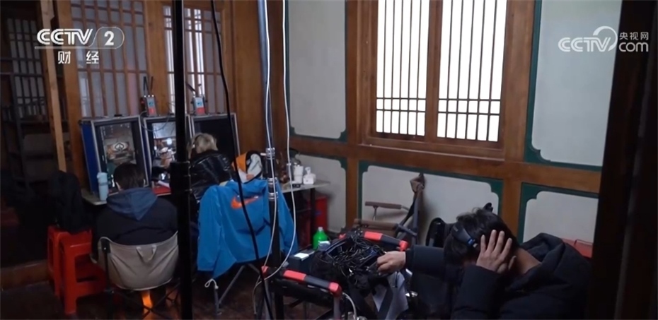 在橫店影視城這棟大樓里,一個微短劇劇組正在加緊拍攝,燈光、攝影、滑軌,專業(yè)設備通通就位,講戲、對詞、走位,演員全情投入。