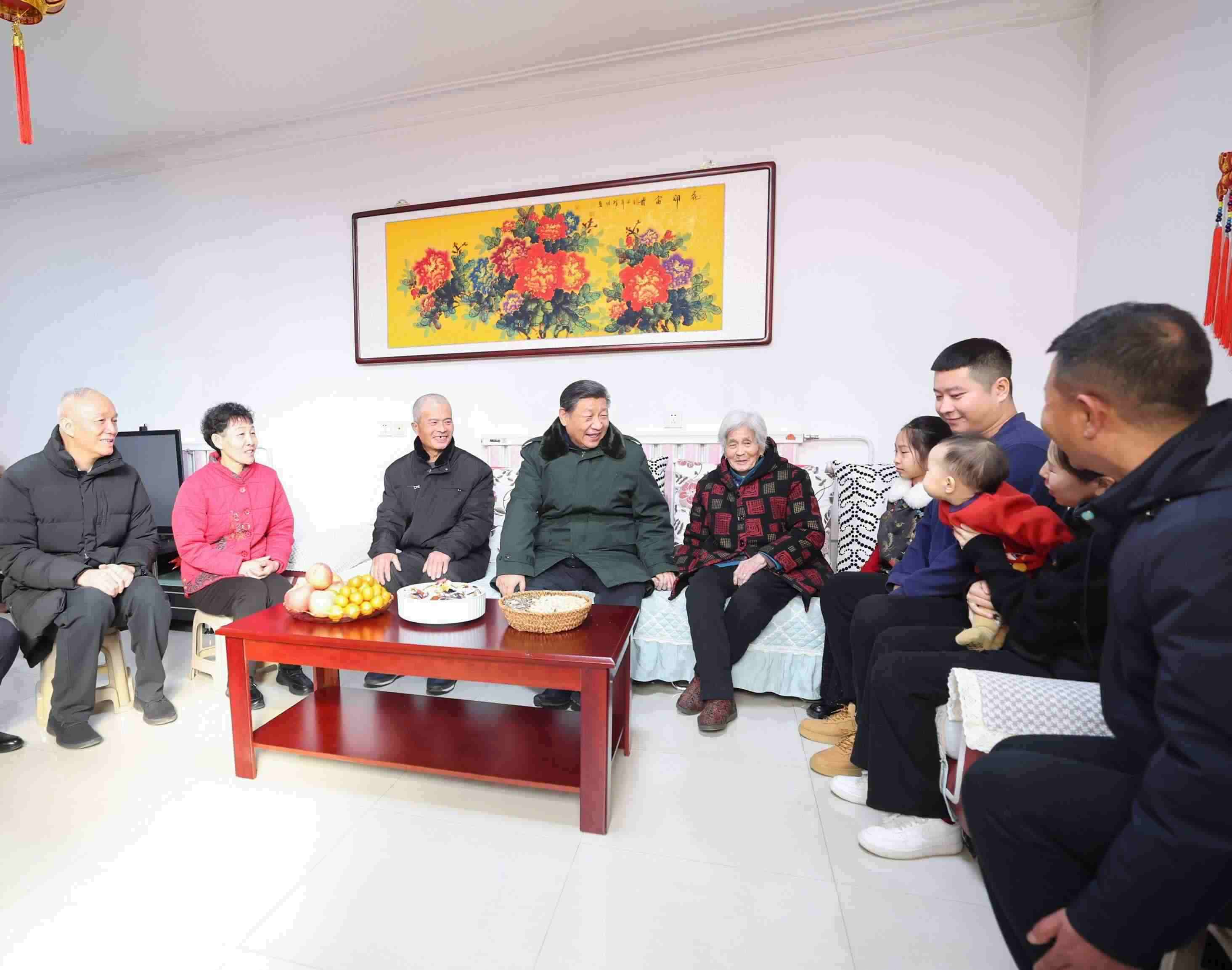 △ 2024年2月1日,習(xí)近平總書記在天津市西青區(qū)辛口鎮(zhèn)第六埠村考察時,同村民杜洪剛一家人親切拉家常。