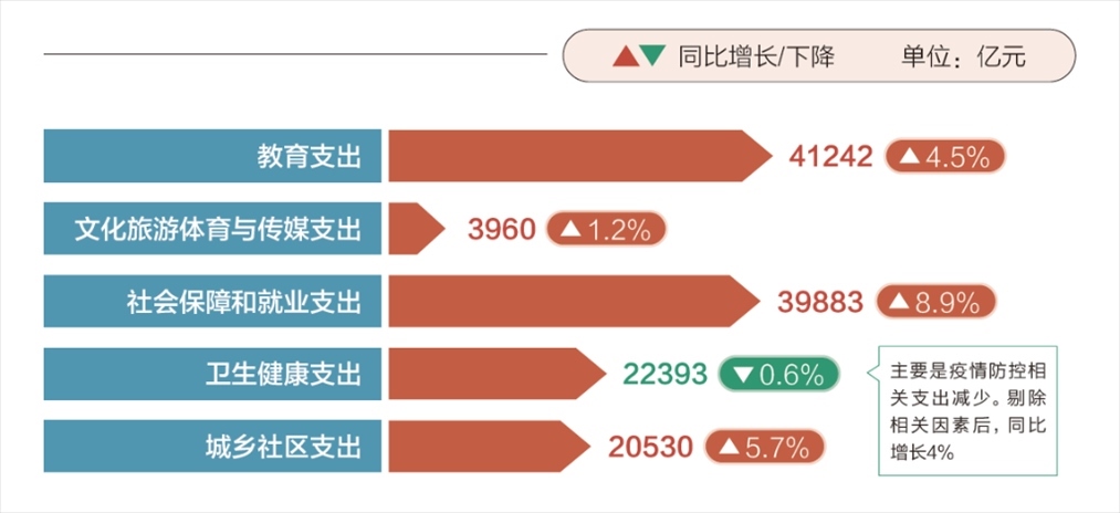 2023年,盡管財(cái)政收支壓力很大,但民生投入力度不減。超過(guò)27萬(wàn)億元全國(guó)一般公共預(yù)算支出中,教育、社會(huì)保障和就業(yè)支出都在4萬(wàn)億元上下,衛(wèi)生健康、城鄉(xiāng)社區(qū)支出都超過(guò)了2萬(wàn)億元。