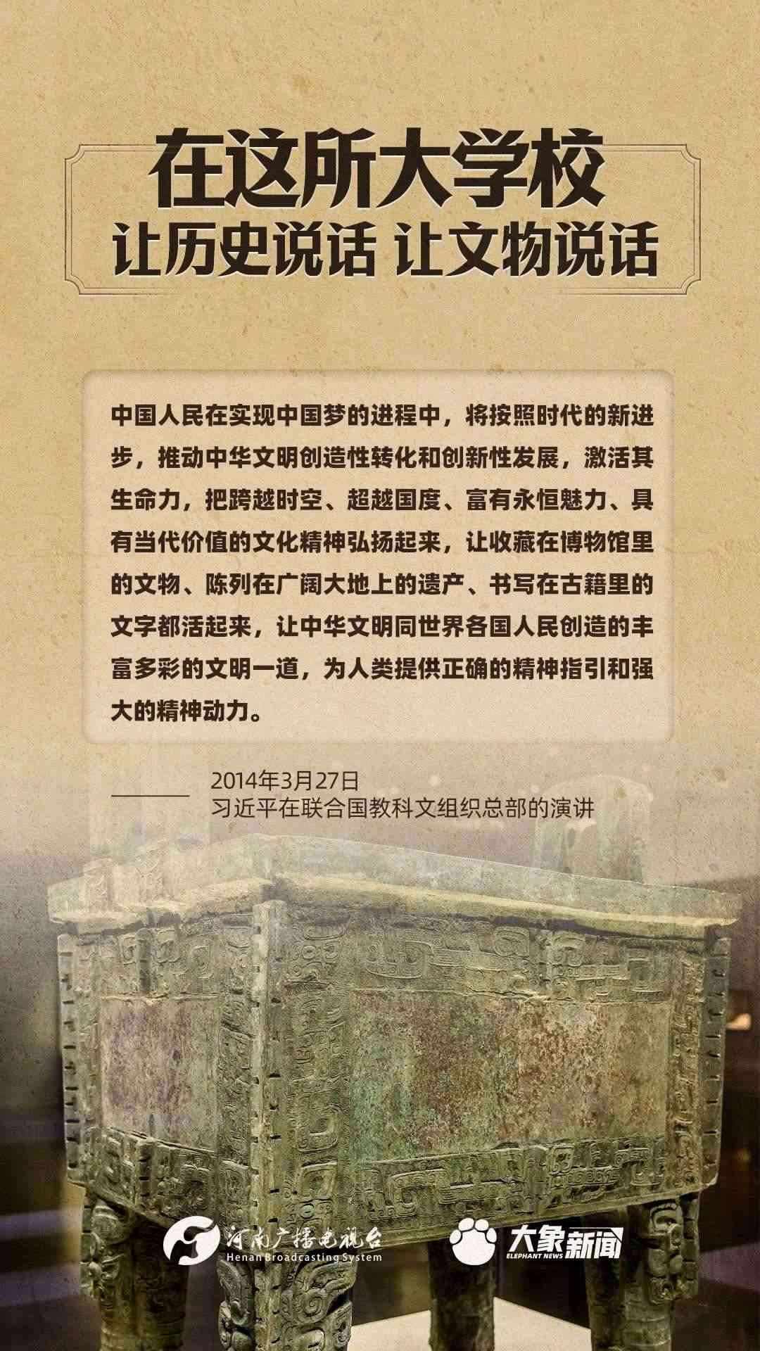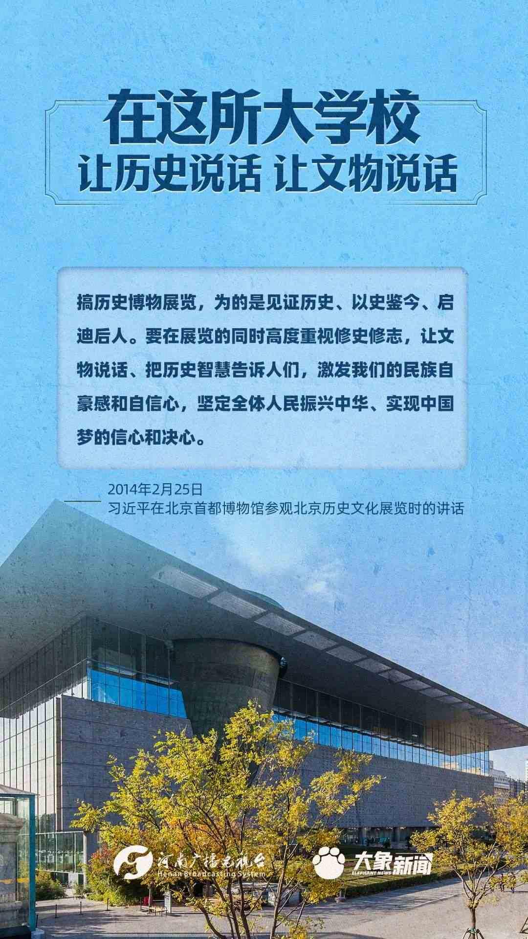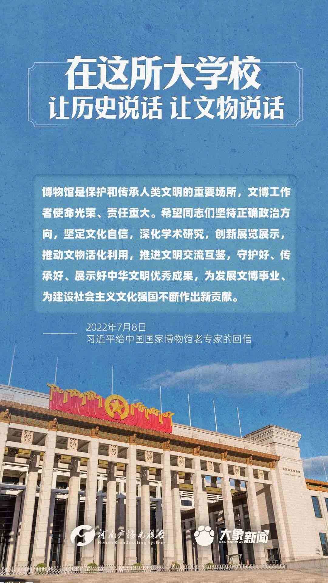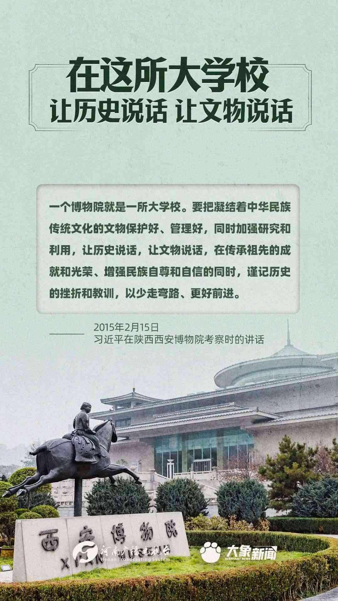 習(xí)近平總書記一直高度重視博物館工作,多次作出重要講話,強(qiáng)調(diào)“一個博物院就是一所大學(xué)?!?,指出“讓歷史說話,讓文物說話”,要求“守護(hù)好、傳承好、展示好中華文明優(yōu)秀成果”等等,金句連連。大象新聞進(jìn)行了認(rèn)真梳理,邀您一起學(xué)習(xí)。