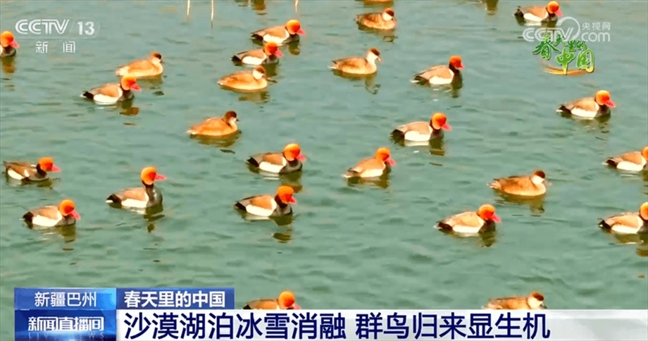 伴隨著陣陣鳥鳴,我們來到新疆巴州尉犁縣羅布淖爾國家濕地公園,碧綠的水面上,成群結(jié)隊的赤嘴潛鴨、赤麻鴨等鳥類時而用翅膀拍打水面展翅飛翔,時而三五成群在水中嬉戲、覓食,群鳥與黃沙、碧水、葦叢、胡楊交相輝映,形成一幅生機勃勃的春日畫卷。