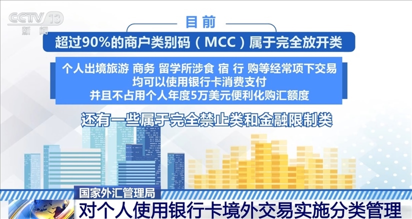 根據(jù)規(guī)定,目前,超過90%的商戶類別碼屬于完全放開類,個人出境旅游、商務(wù)、留學所涉食、宿、行、購等經(jīng)常項下交易,均可以使用銀行卡消費支付,并且不占用個人年度5萬美元便利化購匯額度。此外,還有一些屬于完全禁止類和金融限制類。