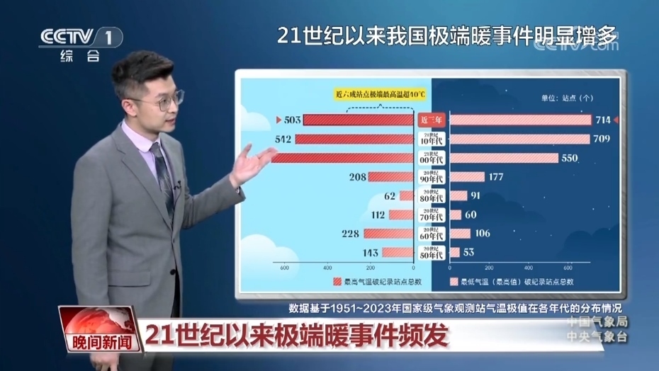 氣象分析師 胡嘯:我們統(tǒng)計了上世紀(jì)50年代以來氣溫創(chuàng)紀(jì)錄的站點(diǎn),從白天的國家級氣象站創(chuàng)紀(jì)錄站點(diǎn)來看,有百分之七十都出現(xiàn)在21世紀(jì),近三年數(shù)量達(dá)到了503個,在這其中有六成站點(diǎn)的極端最高氣溫都突破了40℃。不僅白天的氣溫高,夜間的氣溫也很高,大致有百分之八十的站點(diǎn)都出現(xiàn)在21世紀(jì)。近三年是達(dá)到了714個,這要比以往任何十年的累加都要多。