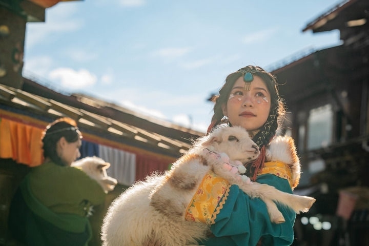游人在獨克宗古城里抱著小羊拍照留念(2023年3月8日攝)。