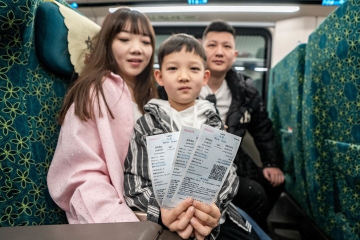 ?在云南昆明,乘坐中老鐵路國際旅客列車前往老撾的游客展示購買到的車票(2024年2月14日攝)。