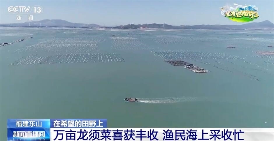 跟隨鏡頭,我們來到豐收的“海上菜田”。在福建漳州東山縣海域,兩萬多畝龍須菜迎來了采收旺季。從空中看去,“龍須菜田”一塊塊排列整齊。漁船穿梭在“海上菜田”中,漁民們接替收割、搬運龍須菜。