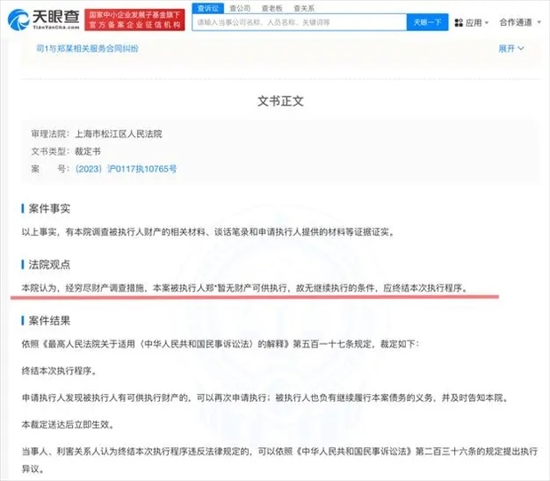 ·近日,演員鄭爽與海寧東開之星影視投資有限公司合同糾紛案件新增執(zhí)行裁定書。經窮盡財產調查措施,法院認定鄭爽無財產可供執(zhí)行。