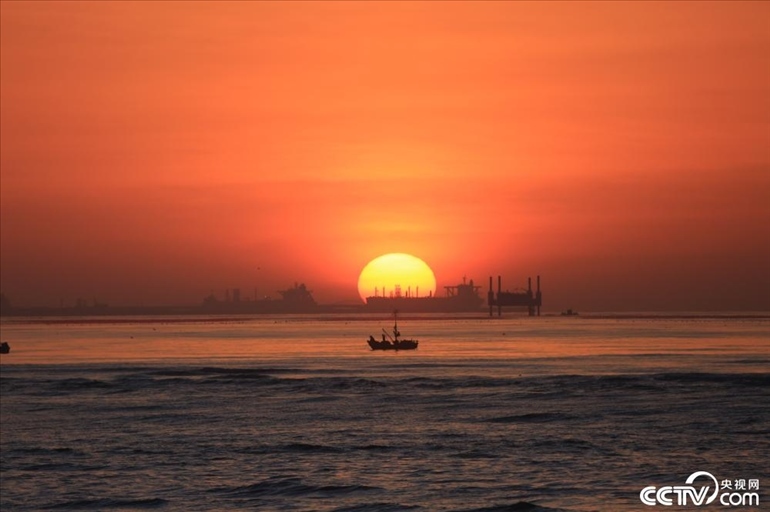 近日,山東省日照市,一輪紅日從海平面緩緩升起,遠處的遠洋巨輪、早起捕魚的漁船與紅日相互映襯,構成了一幅唯美的春天海上日出畫卷。?