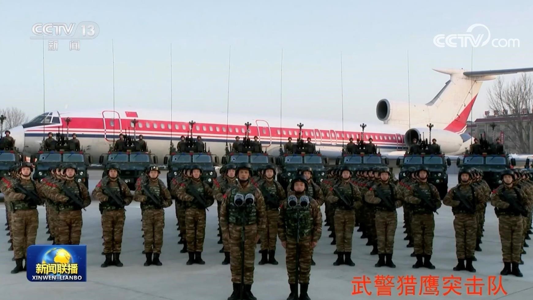 △2023年1月18日,習近平主席在北京八一大樓以視頻方式檢查部隊戰(zhàn)備工作,親切慰問有關部隊。這是武警“獵鷹突擊隊”在進行匯報。