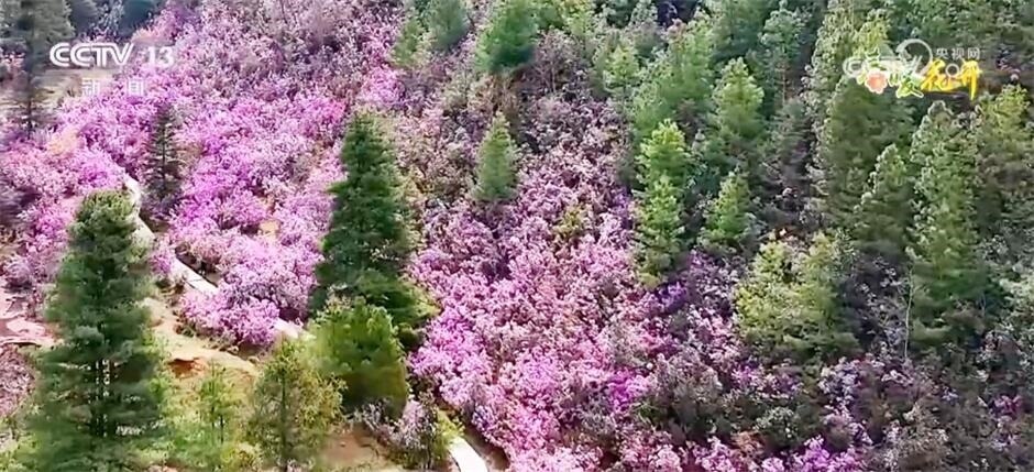 跟隨鏡頭,我們來到云南省怒江州蘭坪縣,在海拔2810米的啦井鎮(zhèn)期井村,漫山遍野的野生杜鵑花競相綻放。馬纓杜鵑、團花杜鵑、假乳黃杜鵑、猴頭杜鵑……山谷里、山坡上,紅的、粉的、黃的,層層疊疊開滿枝頭,隨著山勢起伏跌宕,仿佛浪潮一般,形成了天然的花海。