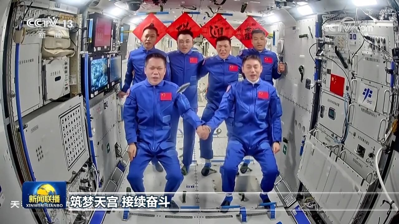 隨后,兩個(gè)航天員乘組拍下“全家?!保餐驙繏焖麄兊娜珖?guó)人民報(bào)平安。