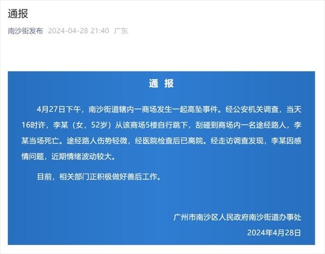 ·廣州一女子商場跳樓砸中路人,官方通報:跳樓者當場死亡,路人傷勢輕微。