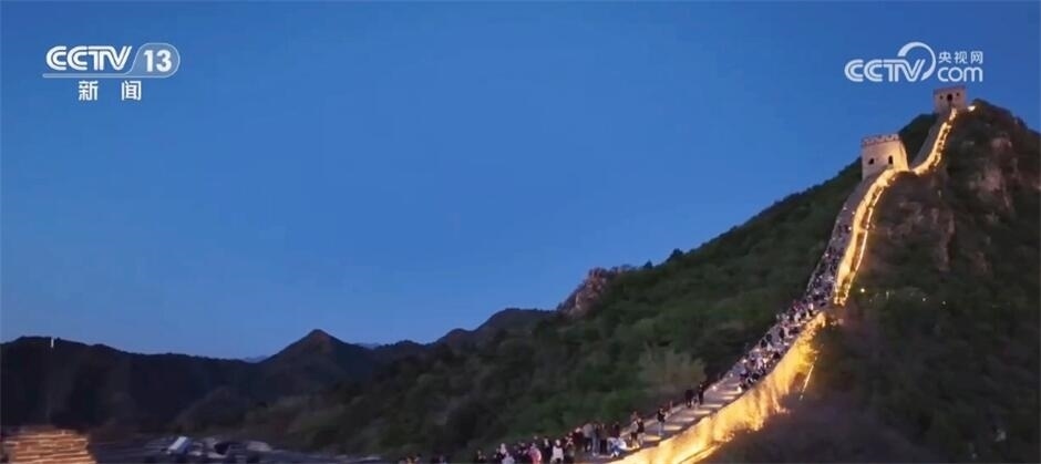在密云,司馬臺(tái)長(zhǎng)城也在夜間被“點(diǎn)亮”,如火龍般在山間蜿蜒。游客可以提燈夜游,感受古長(zhǎng)城的磅礴氣勢(shì),也能泛舟河面,遠(yuǎn)望山巒朦朧,近觀燈火輝煌。景區(qū)還推出音樂、舞蹈、詩歌和繪畫相結(jié)合的演出活動(dòng),無人機(jī)在夜空中的飛行表演也給市民游客帶來了震撼的視聽享受。