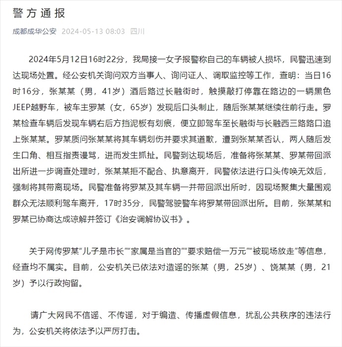·女子要求“觸摸”其車(chē)男子賠1萬(wàn)并叫囂“兒子是市長(zhǎng)”?成都警方:均不屬實(shí),造謠者已被行拘。