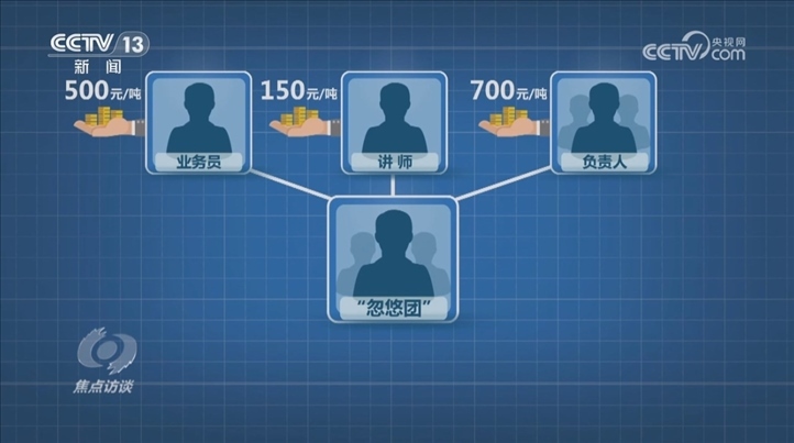 氯化銨和硫酸銨都屬于氮肥的生產(chǎn)原料,成本價約為800—900元/噸。據(jù)專案組調(diào)查,幾個代工廠將原料簡單攪拌裝袋后,賣給定制化肥的總經(jīng)銷商張某華,價格就變成1100—1200元/噸,中間差價約300元/噸;總經(jīng)銷商張某華把化肥交付給代理商張某昌,價格為1375元/噸,差價約200元/噸;張某昌轉(zhuǎn)賣給實體“忽悠團”的價格為1900元/噸,中間差價約500元/噸;“忽悠團”賣給農(nóng)戶的最終價格為3250元/噸,其中:業(yè)務(wù)員每噸抽成500元,講師每噸抽成150元,“忽悠團”幾位負責(zé)人每噸獲利700元。就這樣,每噸成本不到1000元的氮肥,披著復(fù)合肥的外衣,在農(nóng)戶手里翻了三倍多。