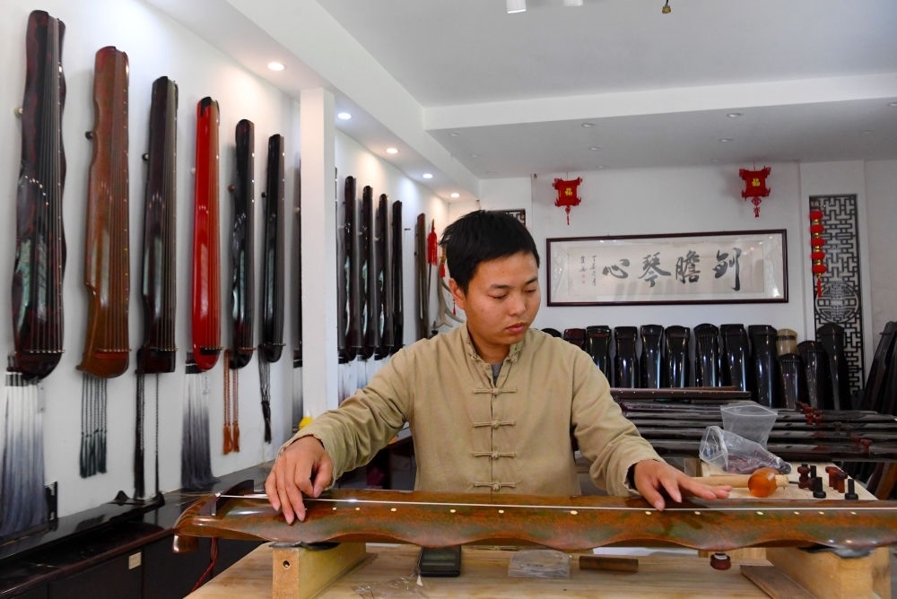 在堌陽鎮(zhèn)徐場村,沿街宅院里傳出打磨木材和動聽的琴瑟之聲。尋聲踏入小院,“90后”琴師徐亞沖正撥動琴弦,調試古琴?!爸魄俨粌H是我們致富的門路,彈琴已成為我們的新生活方式?!?/p>