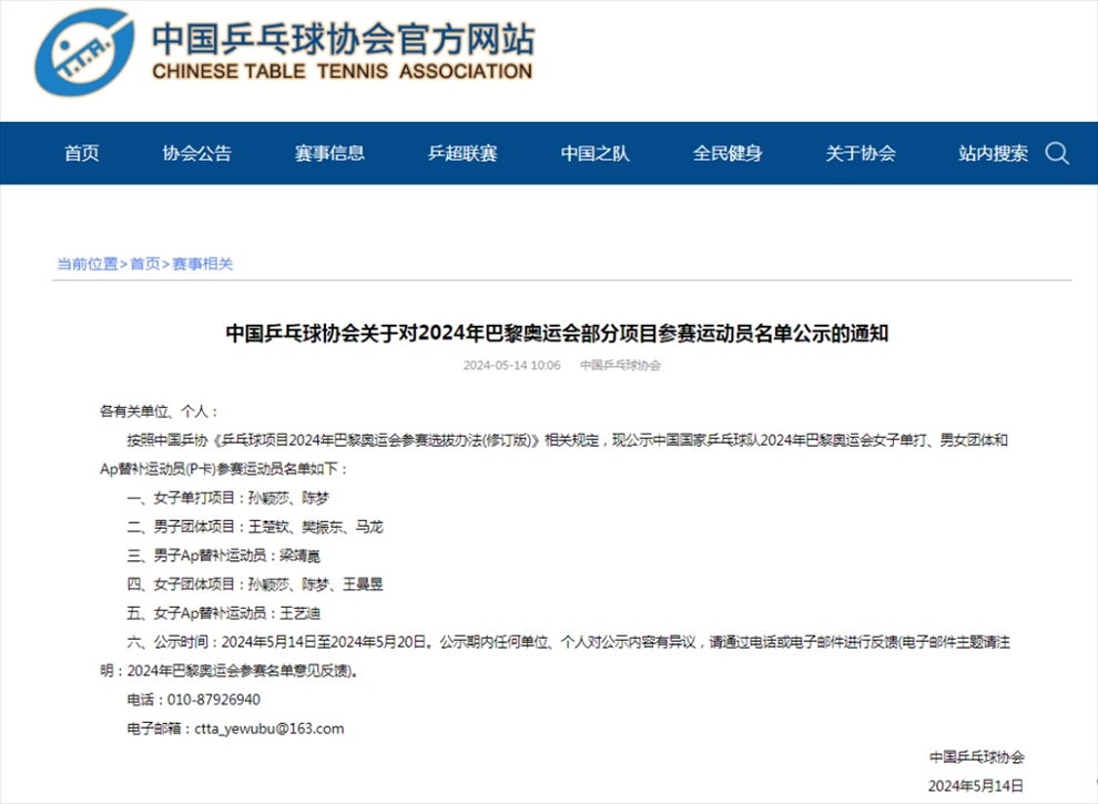 ·中國乒協(xié)公示巴黎奧運會女單、男女團參賽運動員名單。