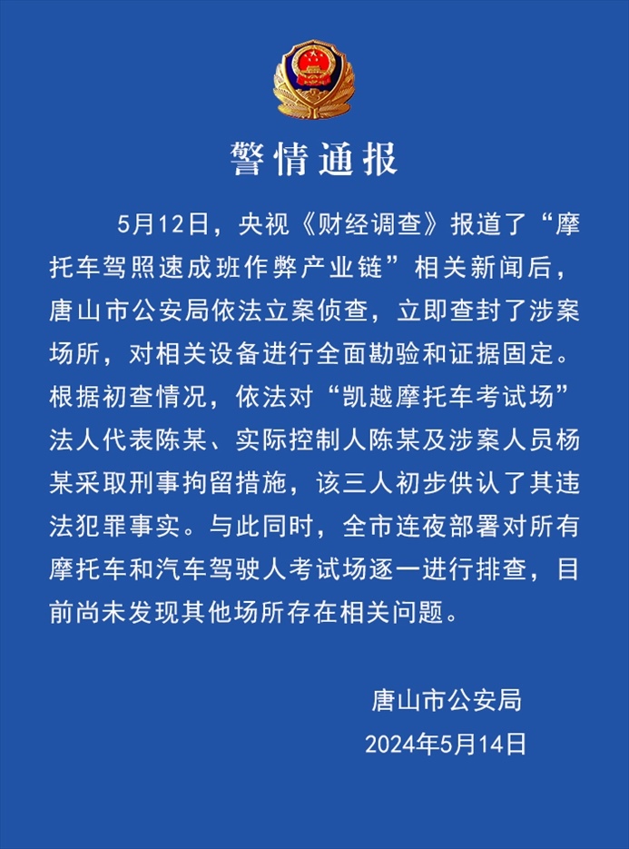 ·唐山警方通報“摩托車駕照速成班作弊產(chǎn)業(yè)鏈”:3人被刑拘。