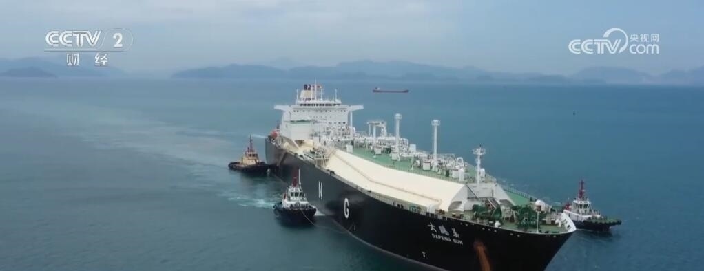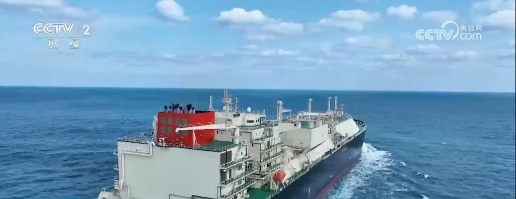 上海市長興島造船基地,記者身后的巨輪是我國新一代天然氣運輸船“綠能瀛”,它總長299米,寬度是46.4米,這一艘船的用鋼量就達到了25000噸,其甲板面積相當于3個標準足球場,可裝載17.4萬立方米液化天然氣,能夠滿足700萬個家庭一個月的用氣需求。