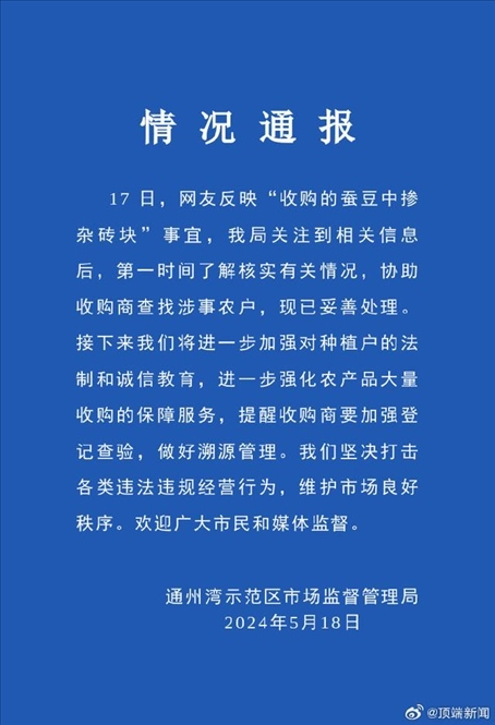 ·網(wǎng)友反映“收購(gòu)的蠶豆中摻雜磚塊”,南通發(fā)布情況通報(bào)。
