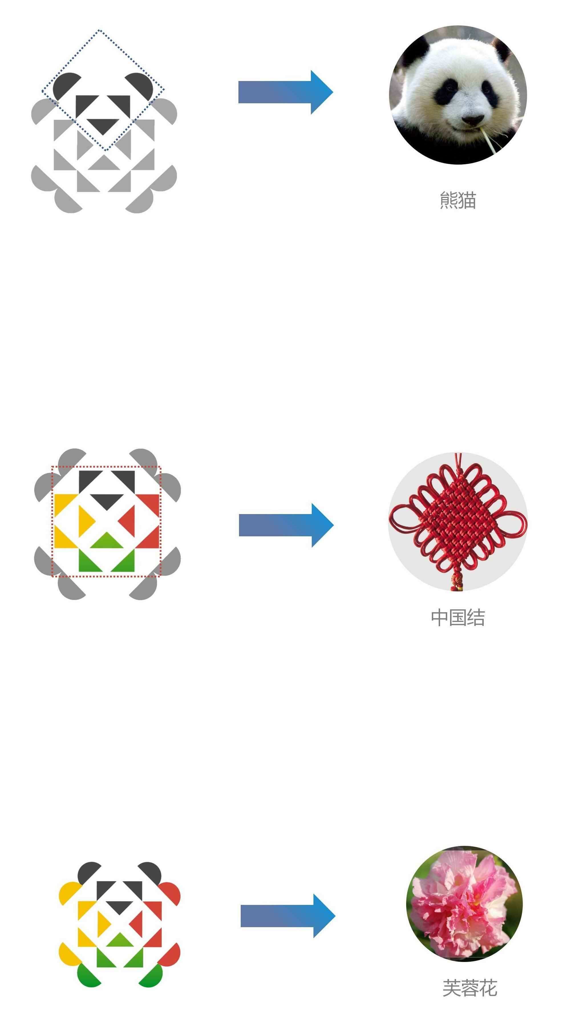 會(huì)徽設(shè)計(jì)靈感源于中國的大熊貓、芙蓉花和中國結(jié),以中國紅、金沙黃、公園綠、熊貓黑、雪山白為主色調(diào)。作為 2025 年成都世界運(yùn)動(dòng)會(huì)的重要標(biāo)志,這一會(huì)徽有效傳達(dá)了奧林匹克精神又凸顯了中國傳統(tǒng)元素和成都特色,彰顯了“團(tuán)結(jié)、包容、多樣性”的價(jià)值觀。同時(shí),設(shè)計(jì)師秉承色彩明快、造型簡潔的設(shè)計(jì)理念,其外圍的半圓圖案和內(nèi)部排列的三角形,圍成一朵盛開的芙蓉花;紅、黑、黃、綠、白的幾何色塊拼出可愛的卡通大熊貓。