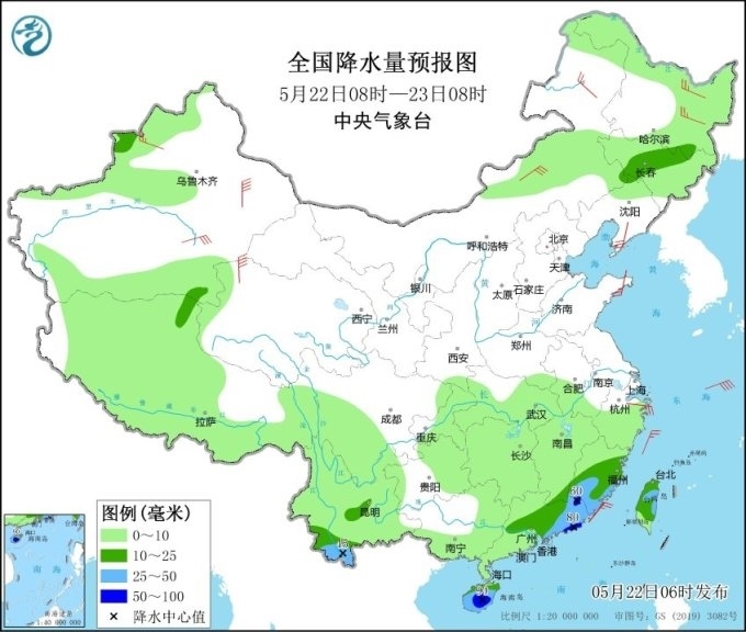 具體來看,22日,全國主要降水區(qū)位于華南沿海、云南南部及東北地區(qū)、新疆北部等地,福建、江西南部、廣東中東部、海南島以及吉林中部、云南南部等地的部分地區(qū)有中到大雨,福建南部、廣東東部、海南島中東部等地局地有暴雨(50~90毫米)。