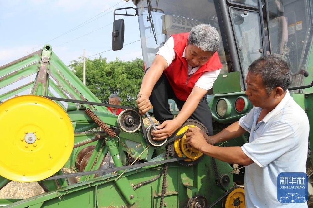 5月26日,在河南省南陽市內(nèi)鄉(xiāng)縣大橋鄉(xiāng),農(nóng)機(jī)服務(wù)人員(右二)為跨區(qū)作業(yè)的農(nóng)機(jī)手提供免費(fèi)機(jī)修服務(wù)。新華社發(fā)(張中立攝)