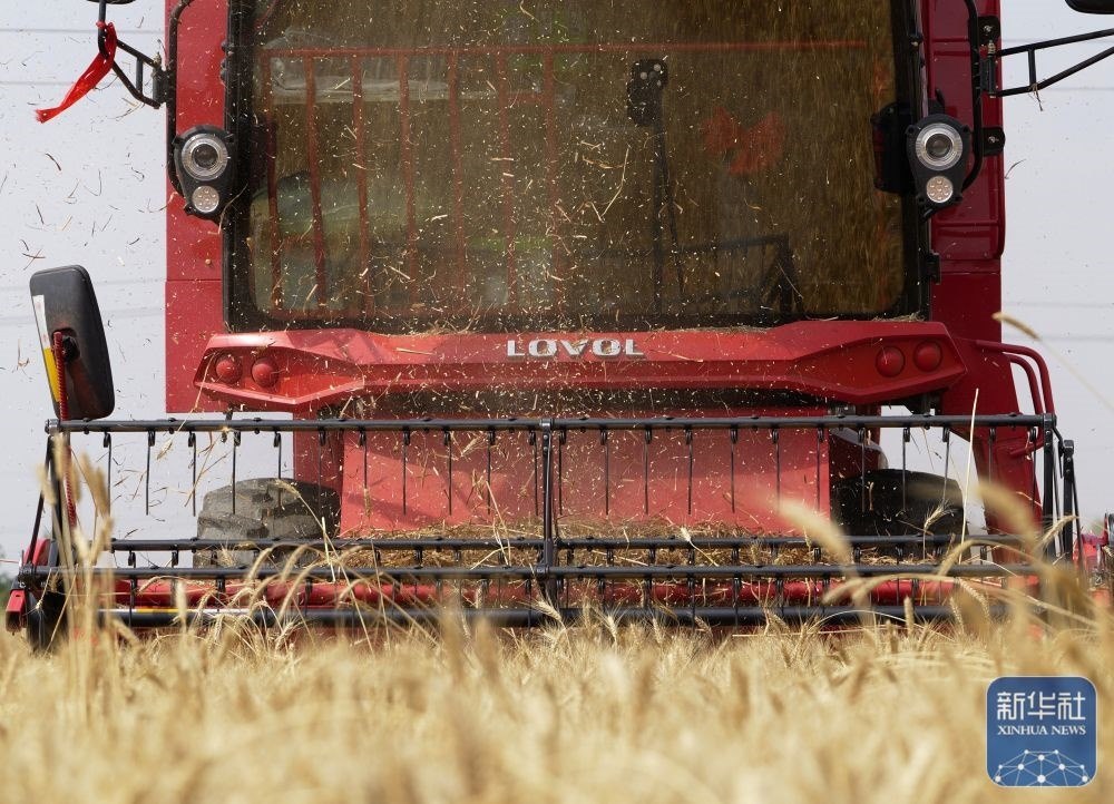 5月26日,收割機(jī)在河南省鄧州市文渠鎮(zhèn)肖店村作業(yè)。新華社記者 李嘉南 攝