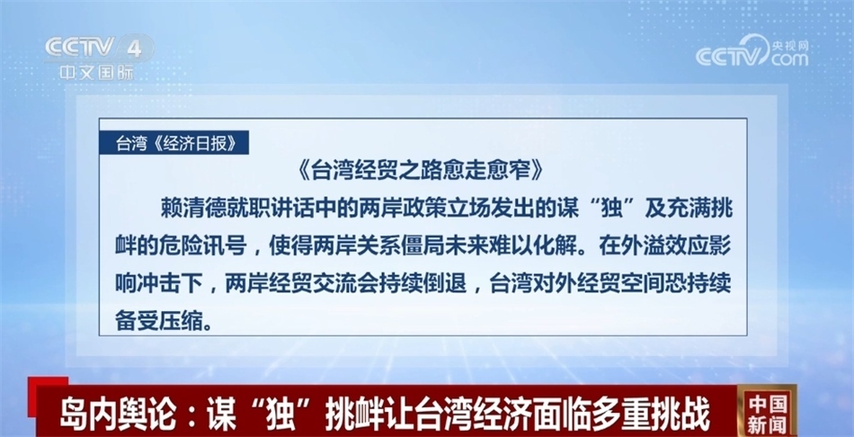 央視網(wǎng)消息:雖然島內(nèi)有關(guān)機構(gòu)預(yù)測今年臺灣經(jīng)濟增長率可達(dá)3%,但賴清德“5·20演說”卻傳遞出謀“獨”挑釁的危險信號。對此,島內(nèi)輿論和有關(guān)人士普遍擔(dān)心,臺海形勢緊張動蕩讓臺灣經(jīng)濟發(fā)展前景“烏云密布”。