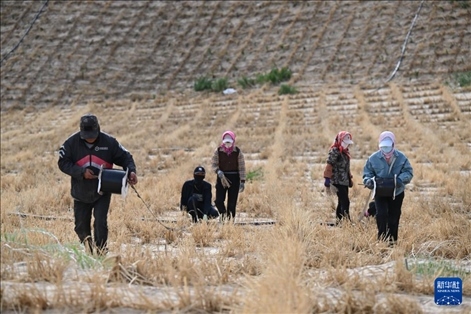 在內(nèi)蒙古赤峰市翁牛特旗巴彥呼交嘎查其白線防沙治沙項(xiàng)目區(qū),治沙工人在拉滴灌帶。新華社記者 連振 攝