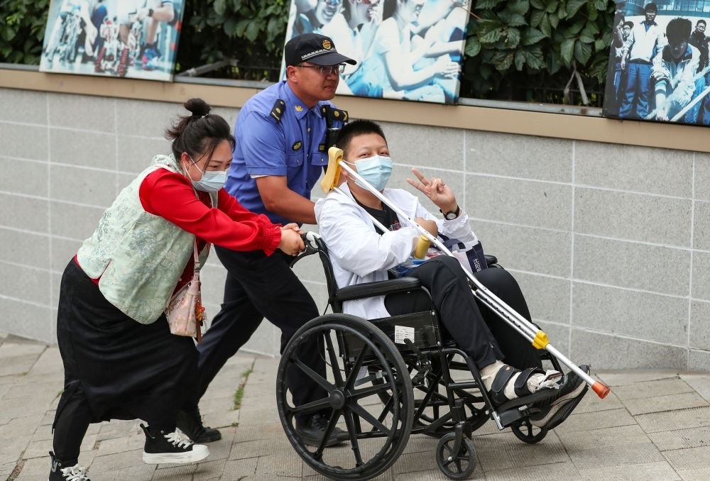 ↑6月7日,一位行動(dòng)不便的考生在家人和沈陽(yáng)市城市管理綜合行政執(zhí)法局工作人員的幫助下抵達(dá)沈陽(yáng)市第五中學(xué)考點(diǎn)。