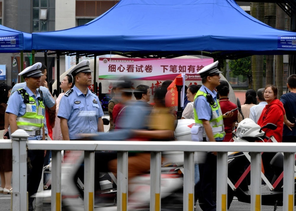 ↑6月7日,在2024年福建省普通高校招生考試福州第十一中學(xué)考點(diǎn)外,交通警察維持周圍秩序。