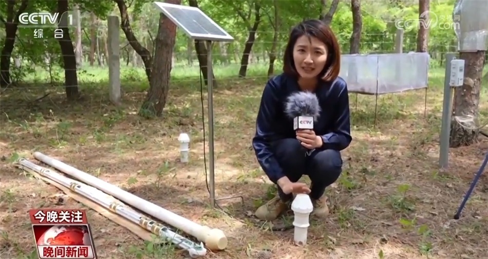 要了解樟子松的生長密碼,單靠監(jiān)測(cè)這一項(xiàng)是不夠的。在整個(gè)林子中,有十幾個(gè)設(shè)備都正在為這片樟子松林做著24小時(shí)不間斷的體檢。像這個(gè)2米長的大管子,像一個(gè)體溫計(jì),里面在不同深度安裝了6層傳感器。把它直接插到土壤中,就可以監(jiān)測(cè)出地塊土壤的濕度、溫度、鹽分、肥力等。