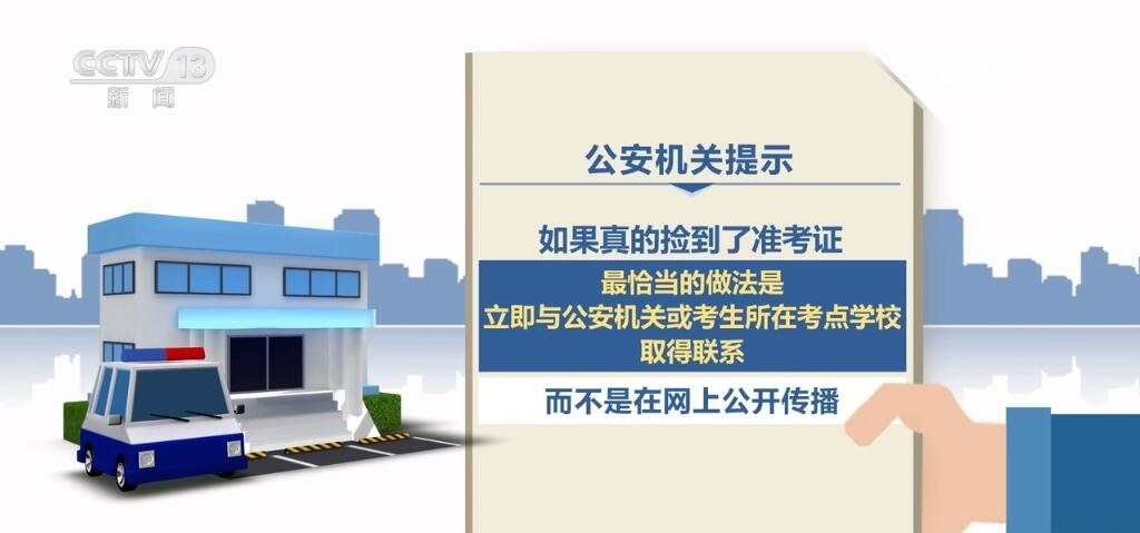 公安機關(guān)提示:如果真的撿到了準考證,最恰當?shù)淖龇ㄊ橇⒓磁c公安機關(guān)或考生所在考點學校取得聯(lián)系,而不是在網(wǎng)上公開傳播。另外,如果看到此類信息的網(wǎng)友,未經(jīng)核實的情況下不轉(zhuǎn)發(fā)、不跟貼、不評論,不撥打相關(guān)聯(lián)系電話,謹防上當受騙。