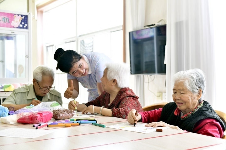 2024年5月25日,在山東省日照市東港區(qū)石臼街道日照幸福護(hù)理院,老人在工作人員的陪護(hù)下做填圖游戲。新華社記者 郭緒雷 攝