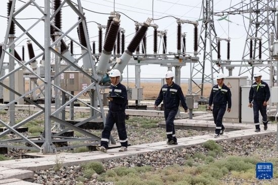 6月25日,在哈薩克斯坦阿拉木圖州謝列克風電場,中哈運行人員進行設備巡檢。白雪騏 攝