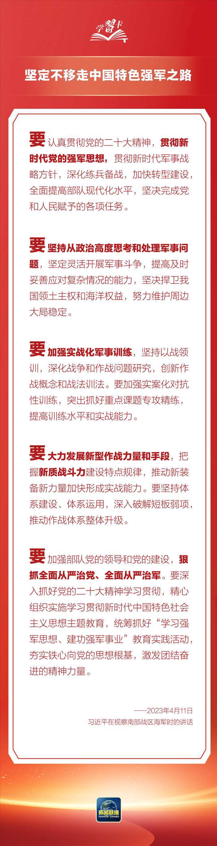 強(qiáng)國(guó)必須強(qiáng)軍,軍強(qiáng)才能?chē)?guó)安。習(xí)近平總書(shū)記在不同場(chǎng)合多次就強(qiáng)軍興軍發(fā)表重要論述。他強(qiáng)調(diào),黨對(duì)軍隊(duì)的絕對(duì)領(lǐng)導(dǎo),是人民軍隊(duì)的建軍之本、強(qiáng)軍之魂。在八一建軍節(jié)到來(lái)之際,一起學(xué)習(xí)↓↓