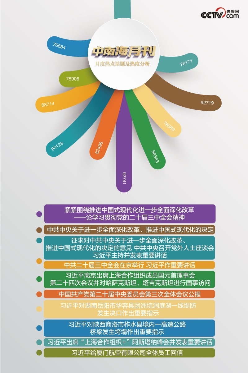 央視網(wǎng)“智聞”系統(tǒng)提取分析2024年7月全網(wǎng)時政新聞熱點(diǎn)顯示,本月“中共中央關(guān)于進(jìn)一步全面深化改革、推進(jìn)中國式現(xiàn)代化的決定”“中共二十屆三中全會在京舉行 習(xí)近平作重要講話”等話題備受關(guān)注。