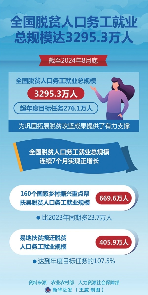 今年以來各級各相關(guān)部門深入開展防止返貧就業(yè)攻堅(jiān)行動,截至8月底,全國脫貧人口務(wù)工就業(yè)總規(guī)模達(dá)到3295.3萬人,超年度目標(biāo)任務(wù)276.1萬人,為鞏固拓展脫貧攻堅(jiān)成果提供了有力支撐。 新華社發(fā) 王威/制圖