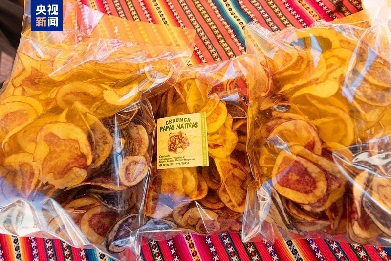 △今年5月30日,秘魯慶祝首個(gè)“國(guó)際馬鈴薯日”。當(dāng)?shù)匾粋€(gè)街頭市場(chǎng)上,展示著用馬鈴薯制成的薯片。