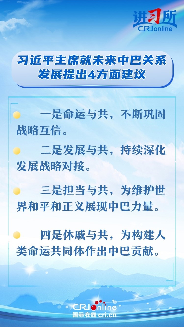今年是中巴建交50周年。習(xí)近平指出,回首過(guò)去50年,中巴關(guān)系跨越山海,探索出發(fā)展中大國(guó)相互尊重、互利友好、合作共贏的正確相處之道。中方愿同巴方一道,以人類前途為懷、以人民福祉為念,不斷豐富新時(shí)代中巴關(guān)系內(nèi)涵,做相互成就的“黃金搭檔”,朝著構(gòu)建人類命運(yùn)共同體、構(gòu)建更公正世界和更可持續(xù)星球的目標(biāo)不斷邁進(jìn),為人類和平和進(jìn)步事業(yè)作出更大貢獻(xiàn)。