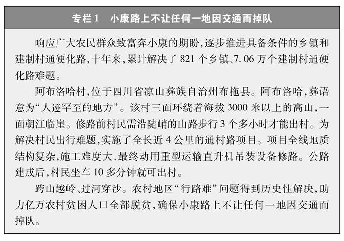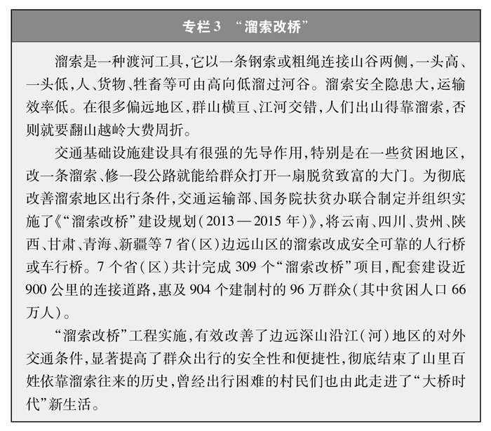 解決特殊地區(qū)出行難題。改一條溜索、修一段公路就能給群眾打開一扇脫貧致富的大門。為了保障偏遠(yuǎn)山區(qū)百姓安全出行,推動(dòng)“溜索改橋”建設(shè),專項(xiàng)資金支持、精心組織實(shí)施,用3年時(shí)間徹底改善了溜索地區(qū)出行條件(專欄3)。推進(jìn)“直過(guò)民族”③和人口較少民族聚居區(qū)農(nóng)村公路建設(shè),解決民族地區(qū)交通閉塞的突出問(wèn)題,加快民族地區(qū)脫貧致富步伐。