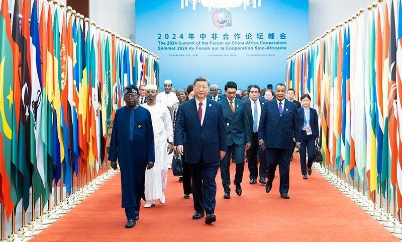 2024年9月5日,習近平主席在北京人民大會堂出席中非合作論壇北京峰會開幕式并發(fā)表主旨講話。這是習主席同外方領(lǐng)導(dǎo)人共同步入會場。