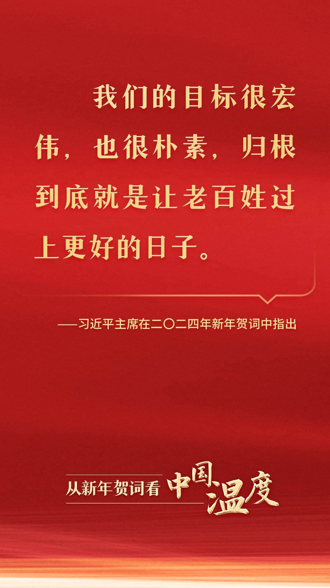 從黃土地走來,從大隊黨支部書記到黨和國家最高領(lǐng)導(dǎo)人,習(xí)近平同志深諳國情、社情、民情。在二〇二四年新年賀詞中,習(xí)近平主席話語懇切:“我們的目標(biāo)很宏偉,也很樸素,歸根到底就是讓老百姓過上更好的日子?!?/p>