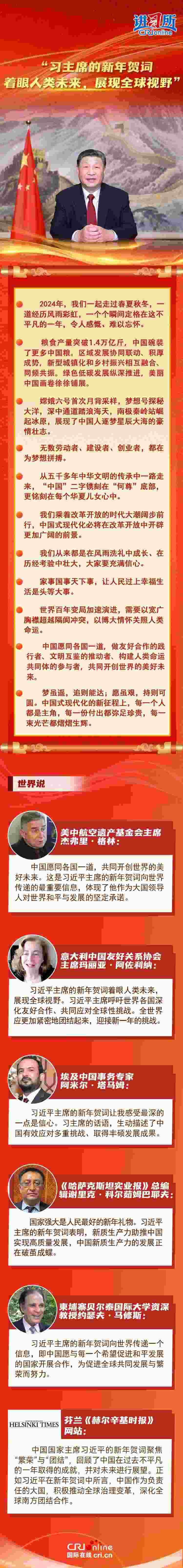 多國人士認為,習(xí)近平主席的新年賀詞著眼人類未來,展現(xiàn)全球視野,體現(xiàn)了作為大國領(lǐng)導(dǎo)人對世界和平與發(fā)展的堅定承諾。